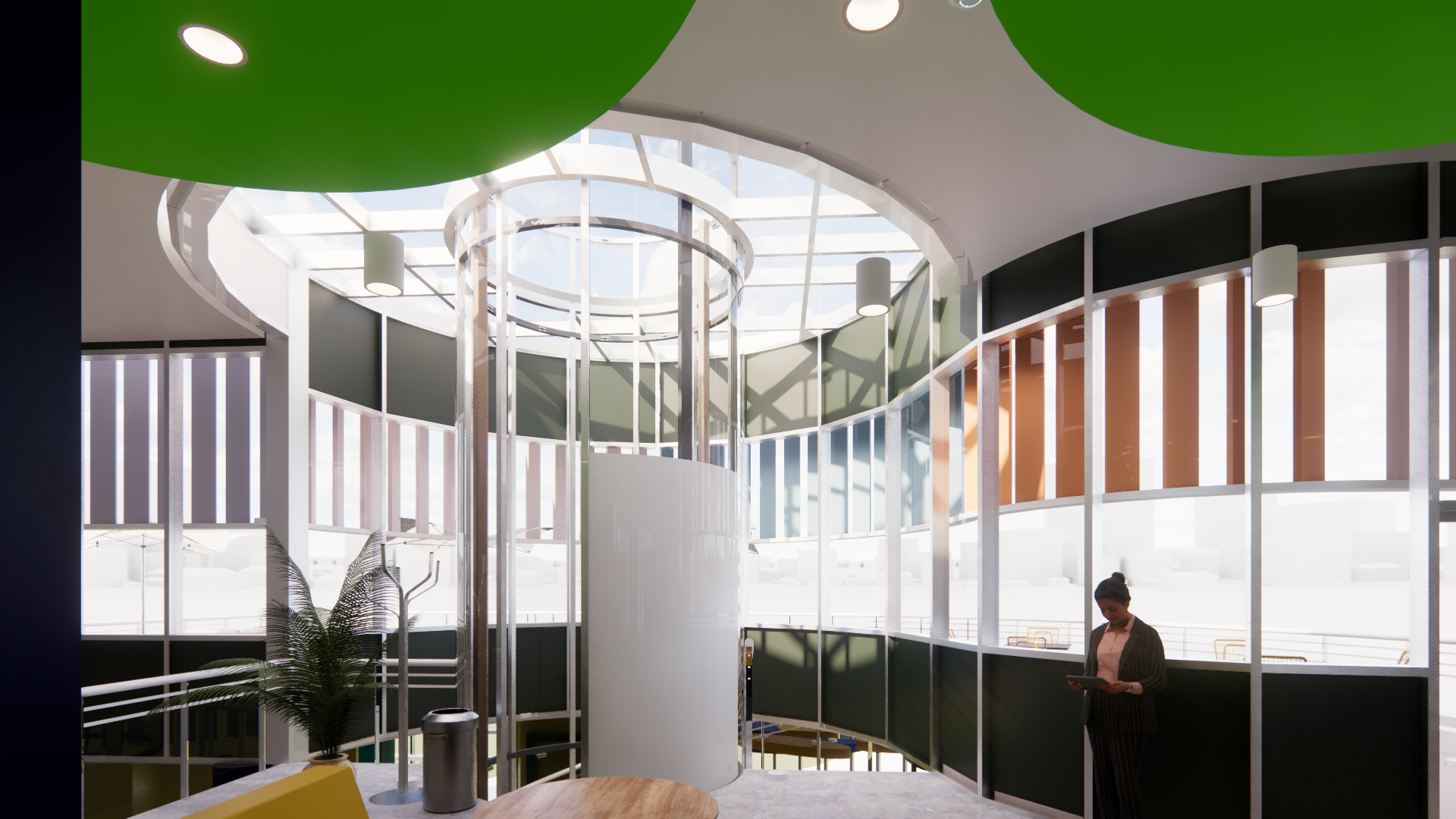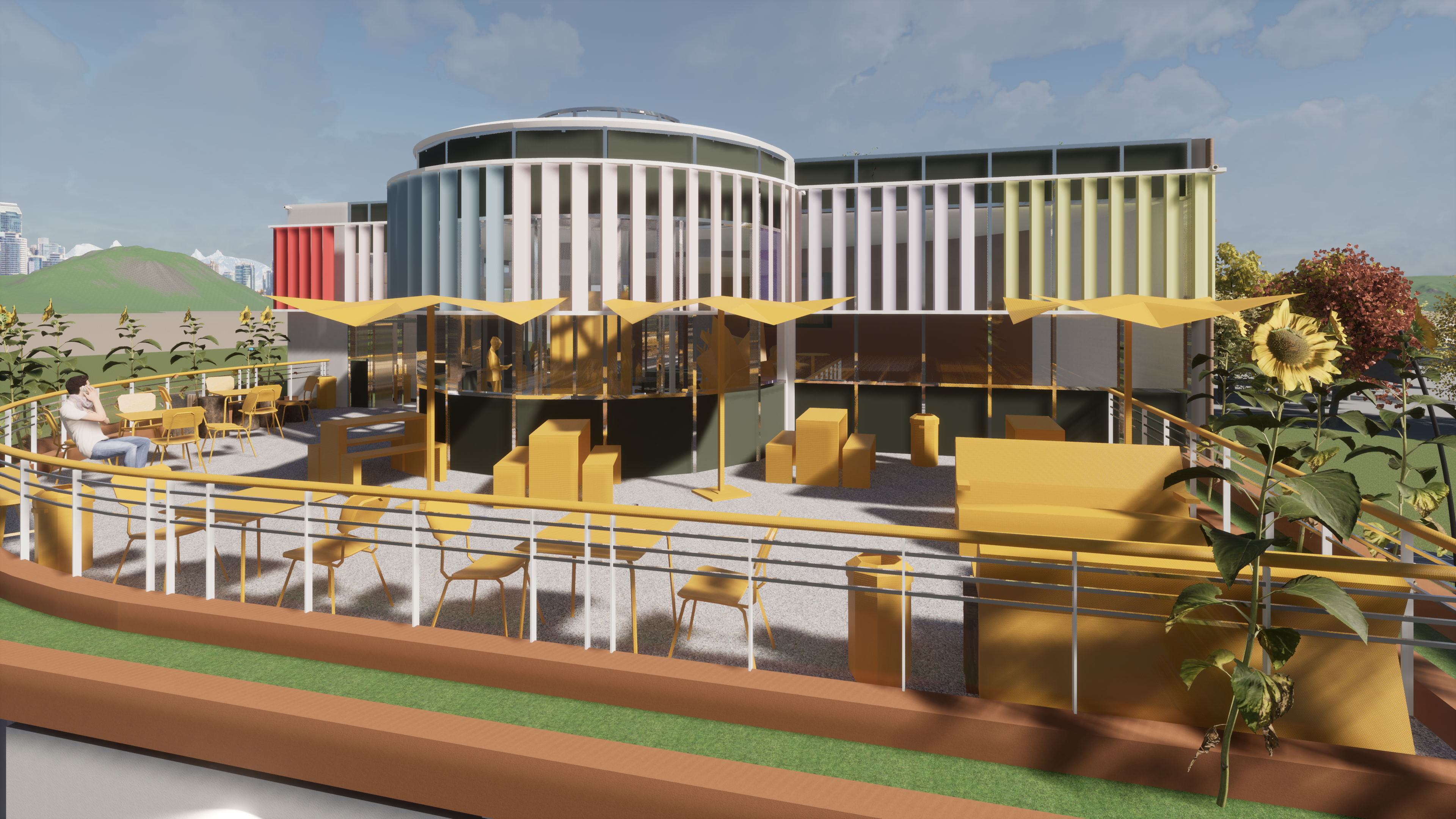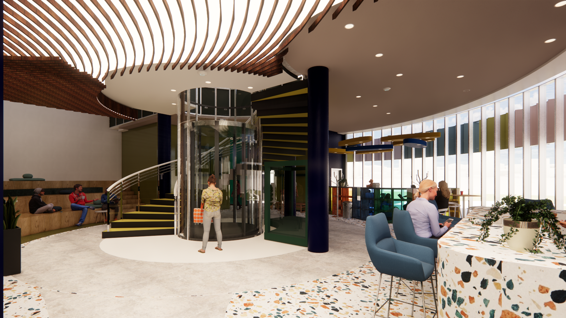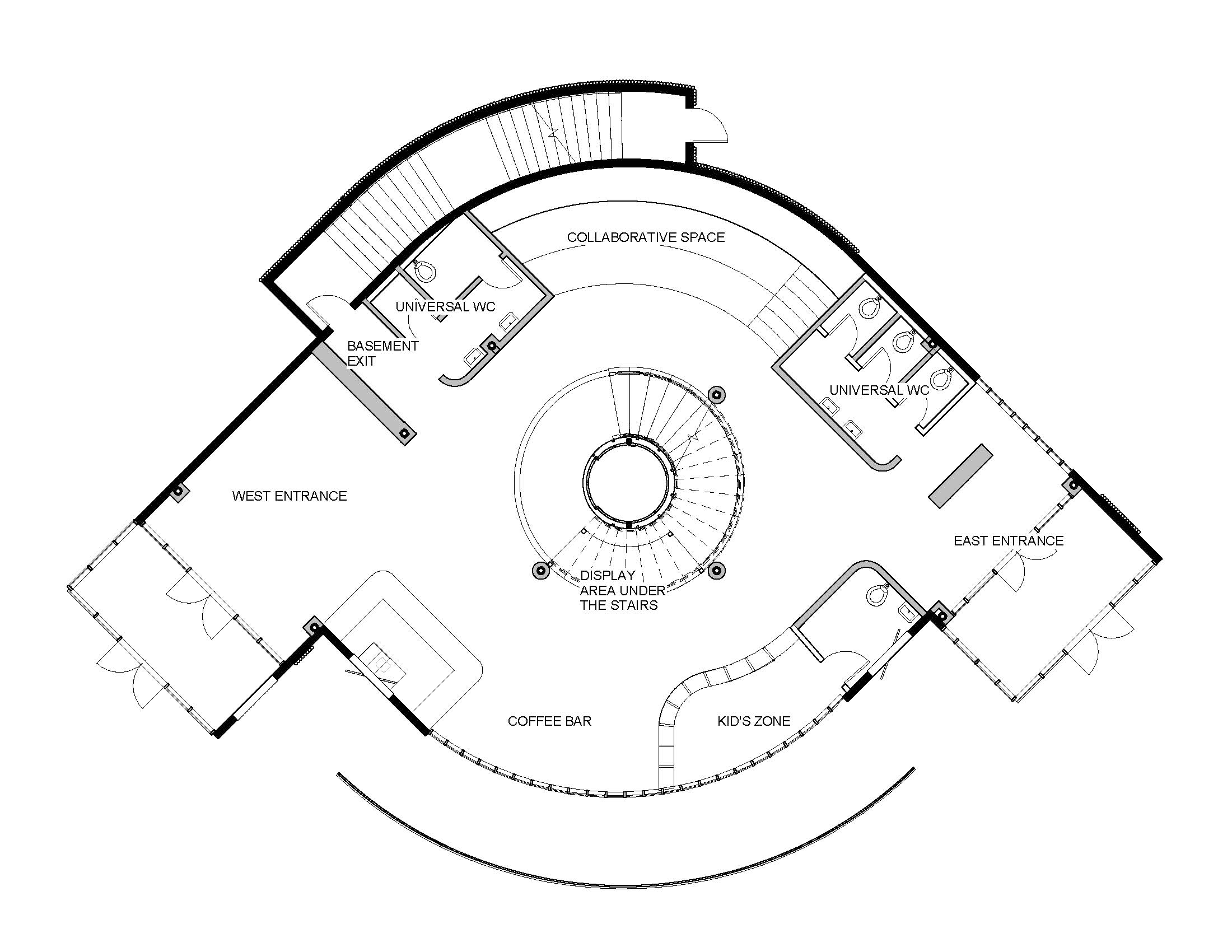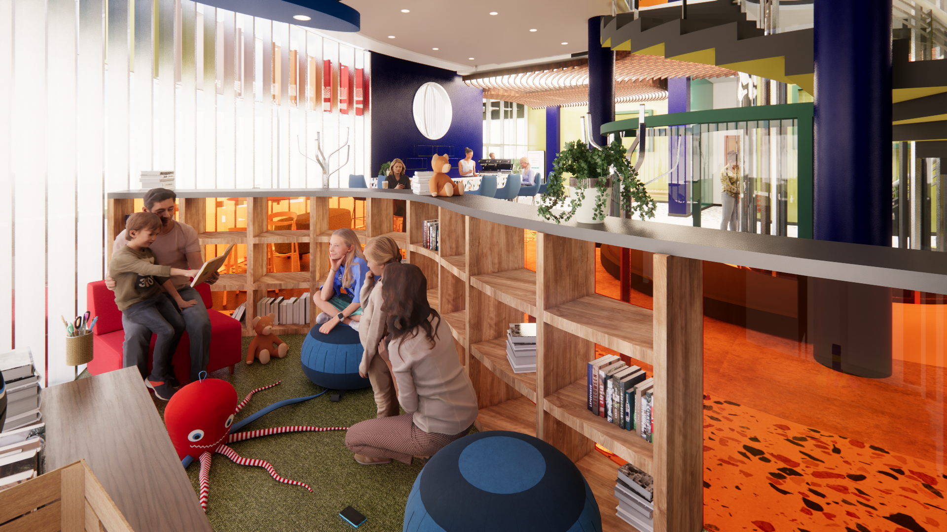 A large, central staircase and round glass elevator were chosen as the central focus point of the building to draw one's eye and the importance of being connected.The open collaboration space can double as a stage for events or as seating for events and studying.Student's work is displayed along the walls and underneath the stairs in easily accessible areas.A kids play area that takes notes from IKEA's Småland is incorporated to accommodate working parents who need a space to work, whether in a group or alone, while having someone watch their kids.A pay-what-you-want style coffee bar is included to acknowledge that you shouldn't be cut off from things just because of your income status.Keeping with the theme of removing income barriers, there are device lockers in the south east entrance that allow visitors to borrow a smart device while on site.