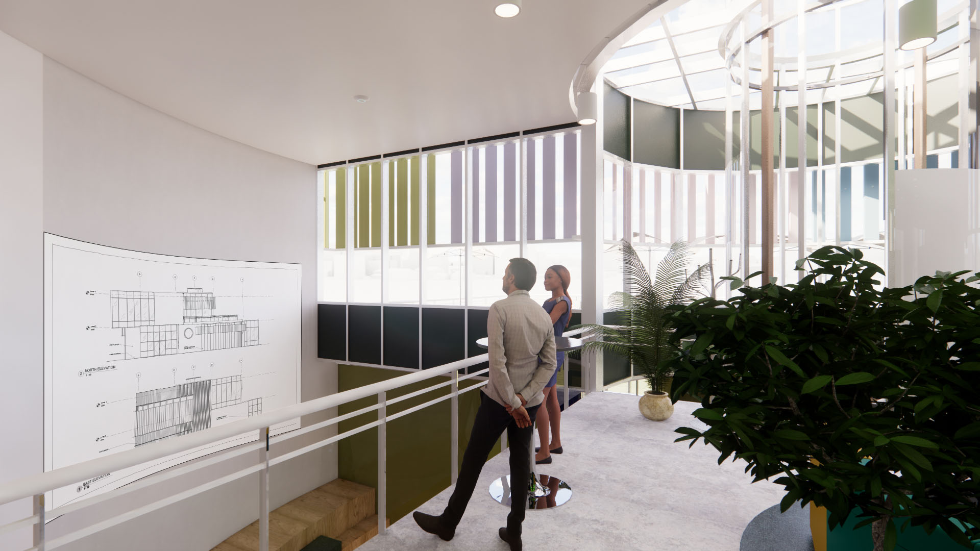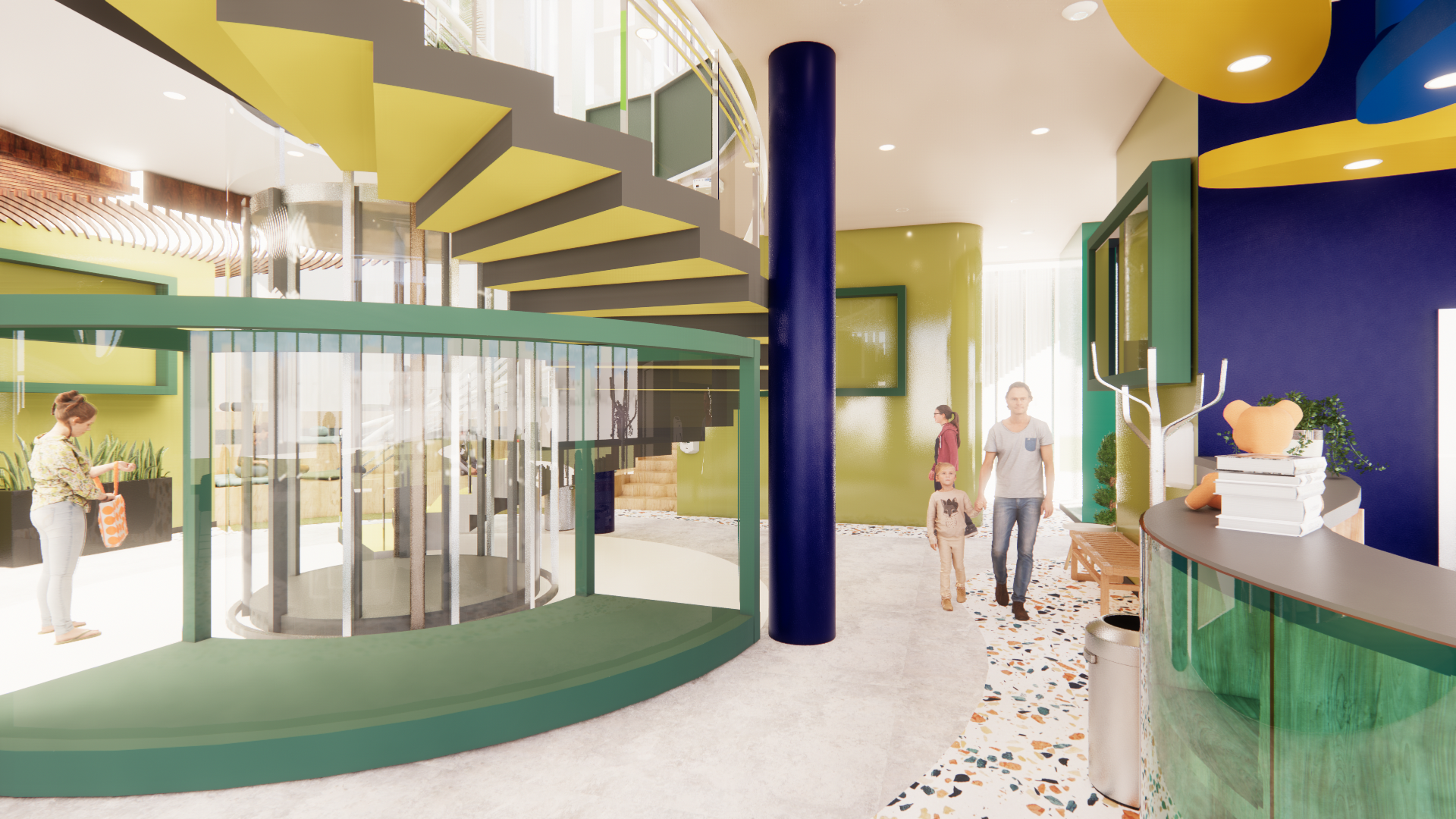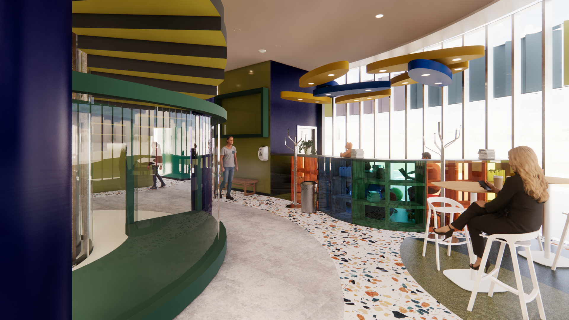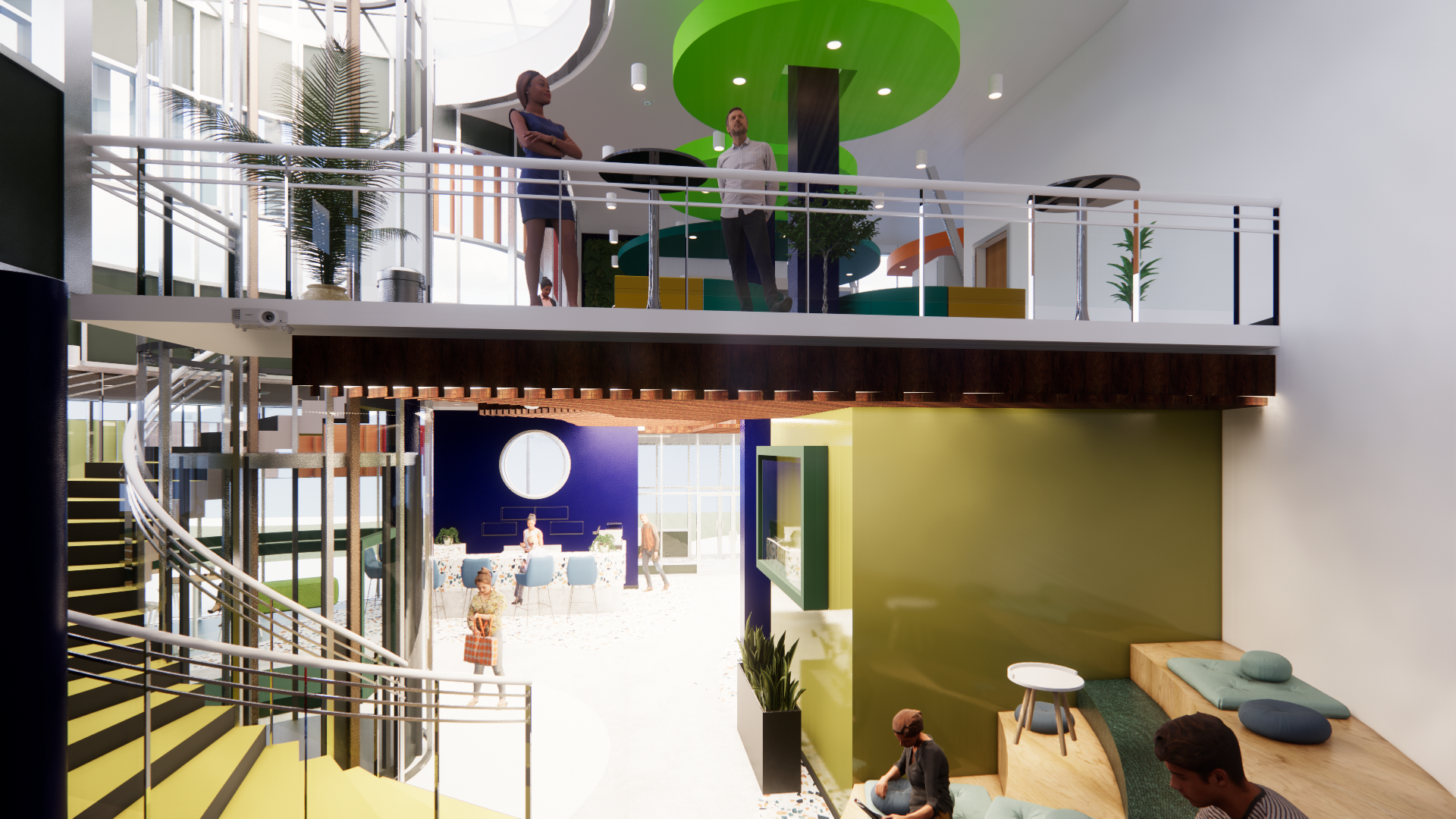 A large, central staircase and round glass elevator were chosen as the central focus point of the building to draw one's eye and the importance of being connected.The open collaboration space can double as a stage for events or as seating for events and studying.Student's work is displayed along the walls and underneath the stairs in easily accessible areas.A kids play area that takes notes from IKEA's Småland is incorporated to accommodate working parents who need a space to work, whether in a group or alone, while having someone watch their kids.A pay-what-you-want style coffee bar is included to acknowledge that you shouldn't be cut off from things just because of your income status.Keeping with the theme of removing income barriers, there are device lockers in the south east entrance that allow visitors to borrow a smart device while on site.