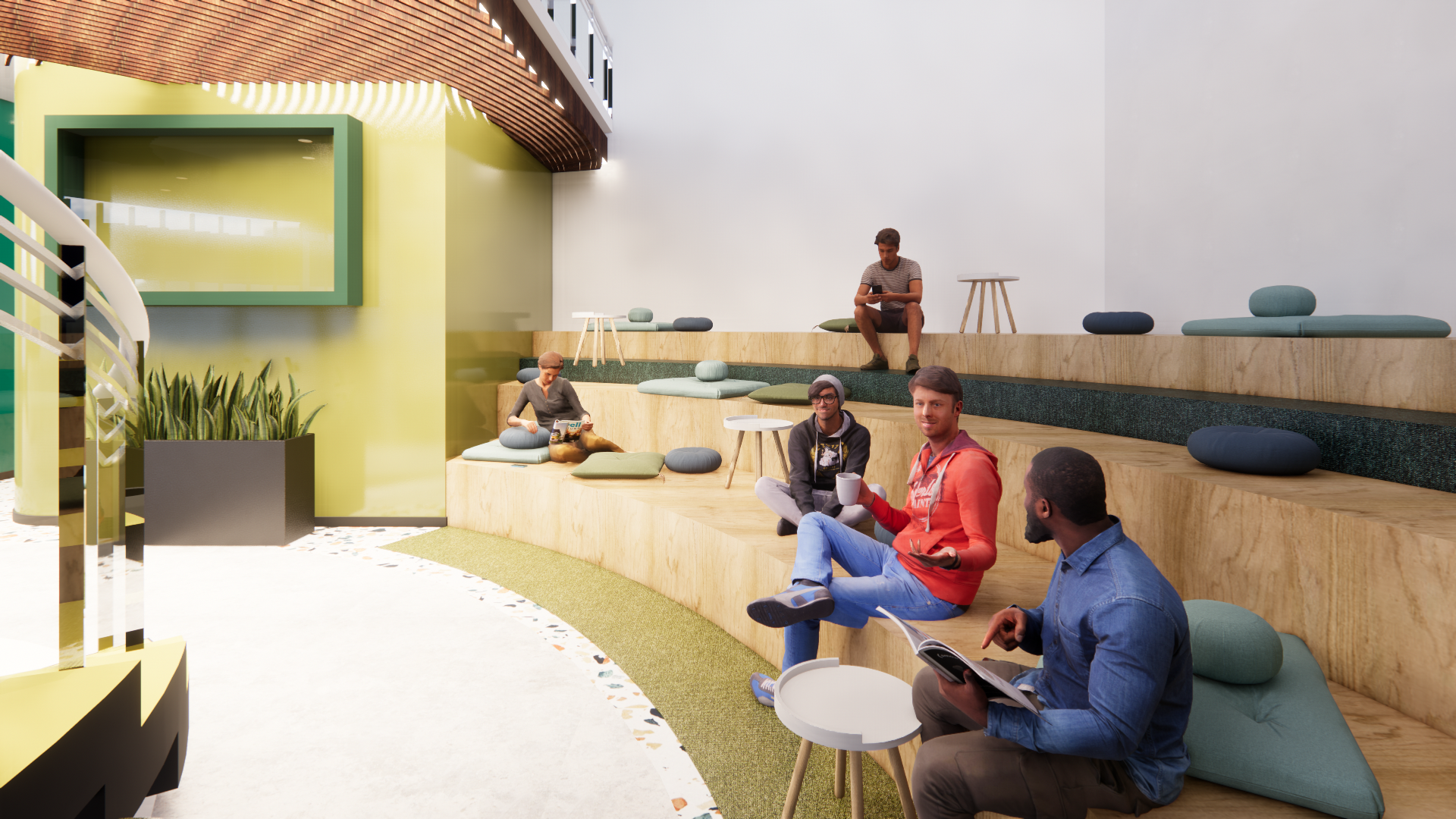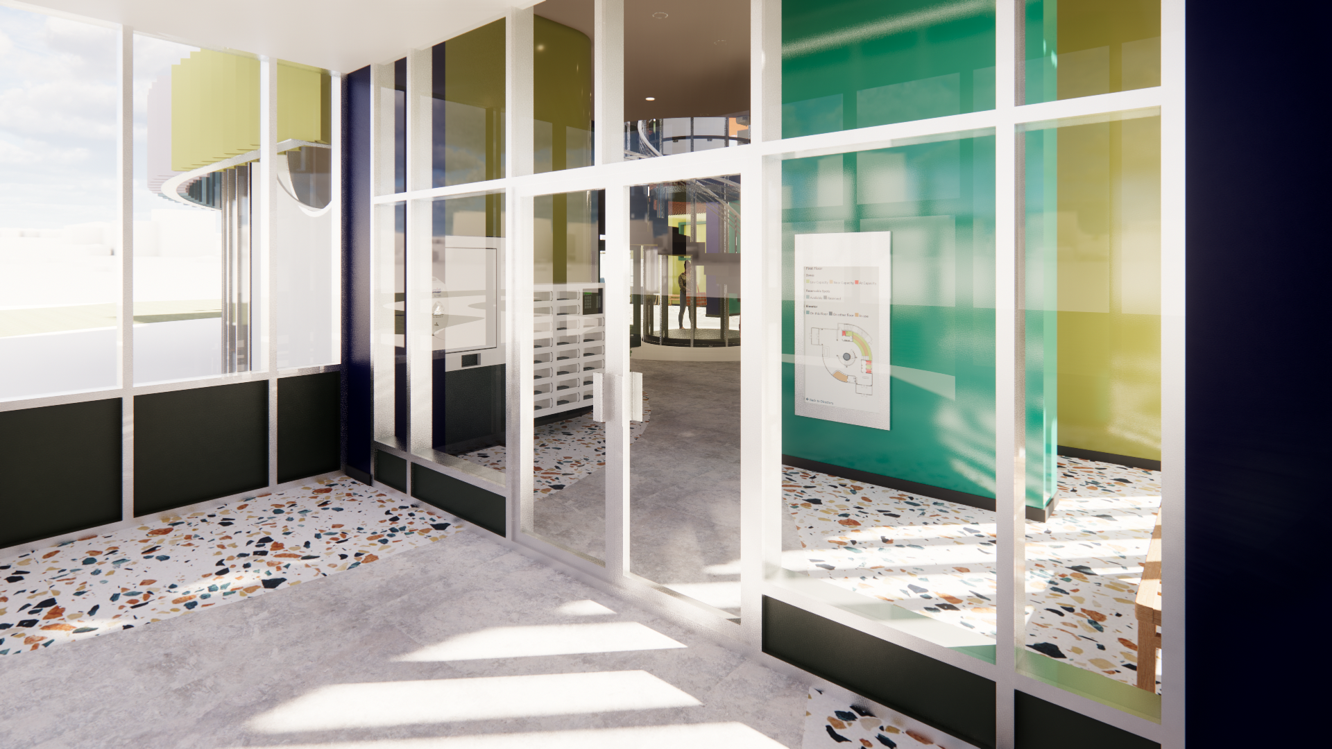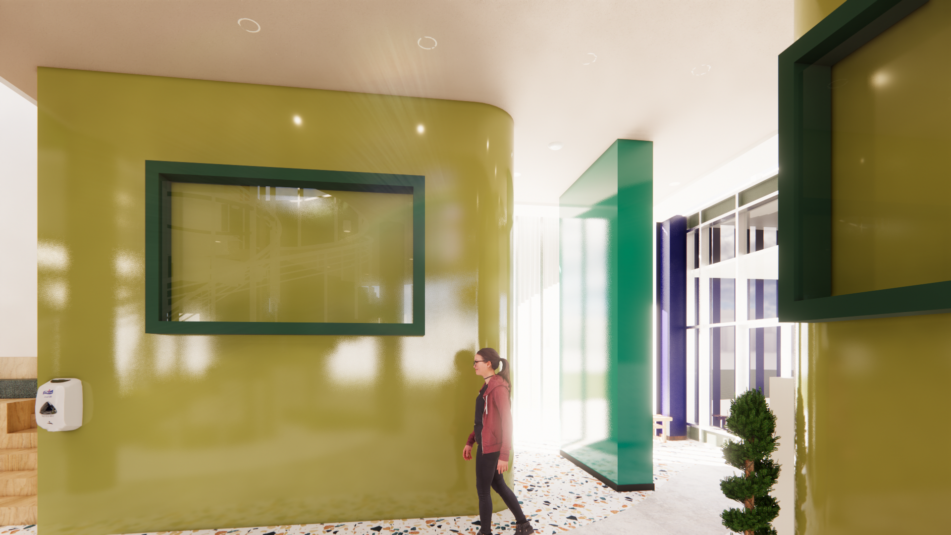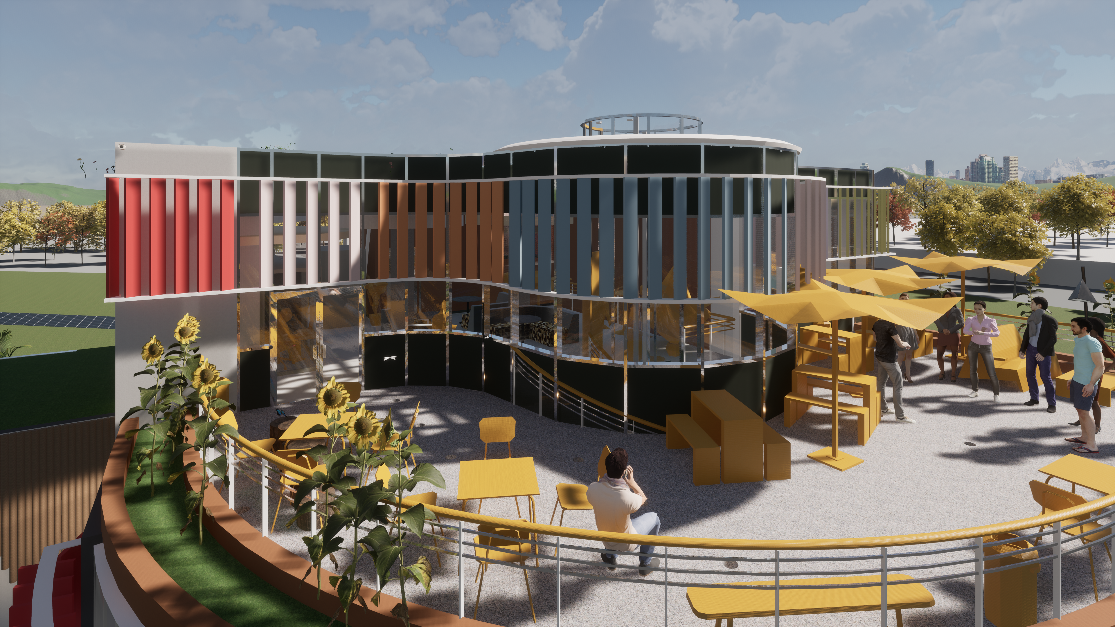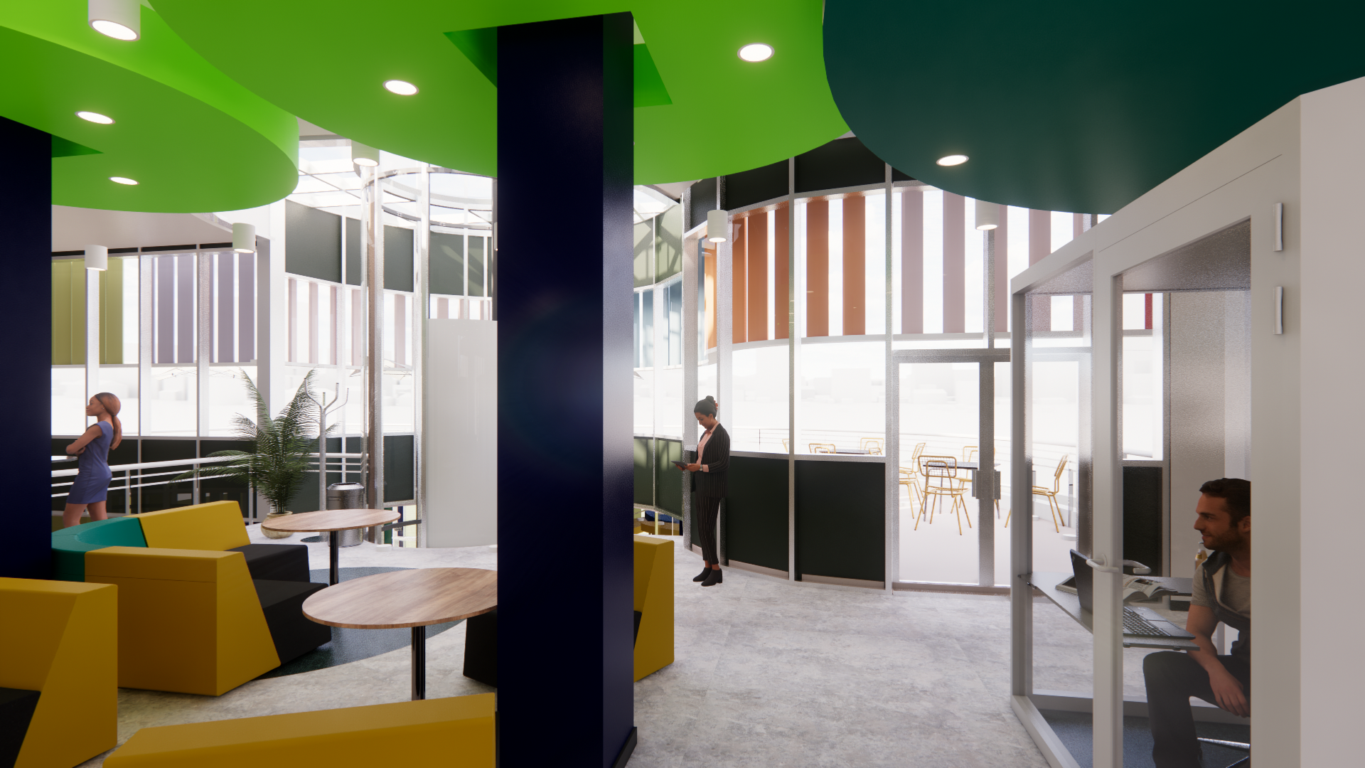 A large, central staircase and round glass elevator were chosen as the central focus point of the building to draw one's eye and the importance of being connected.The open collaboration space can double as a stage for events or as seating for events and studying.Student's work is displayed along the walls and underneath the stairs in easily accessible areas.A kids play area that takes notes from IKEA's Småland is incorporated to accommodate working parents who need a space to work, whether in a group or alone, while having someone watch their kids.A pay-what-you-want style coffee bar is included to acknowledge that you shouldn't be cut off from things just because of your income status.Keeping with the theme of removing income barriers, there are device lockers in the south east entrance that allow visitors to borrow a smart device while on site.