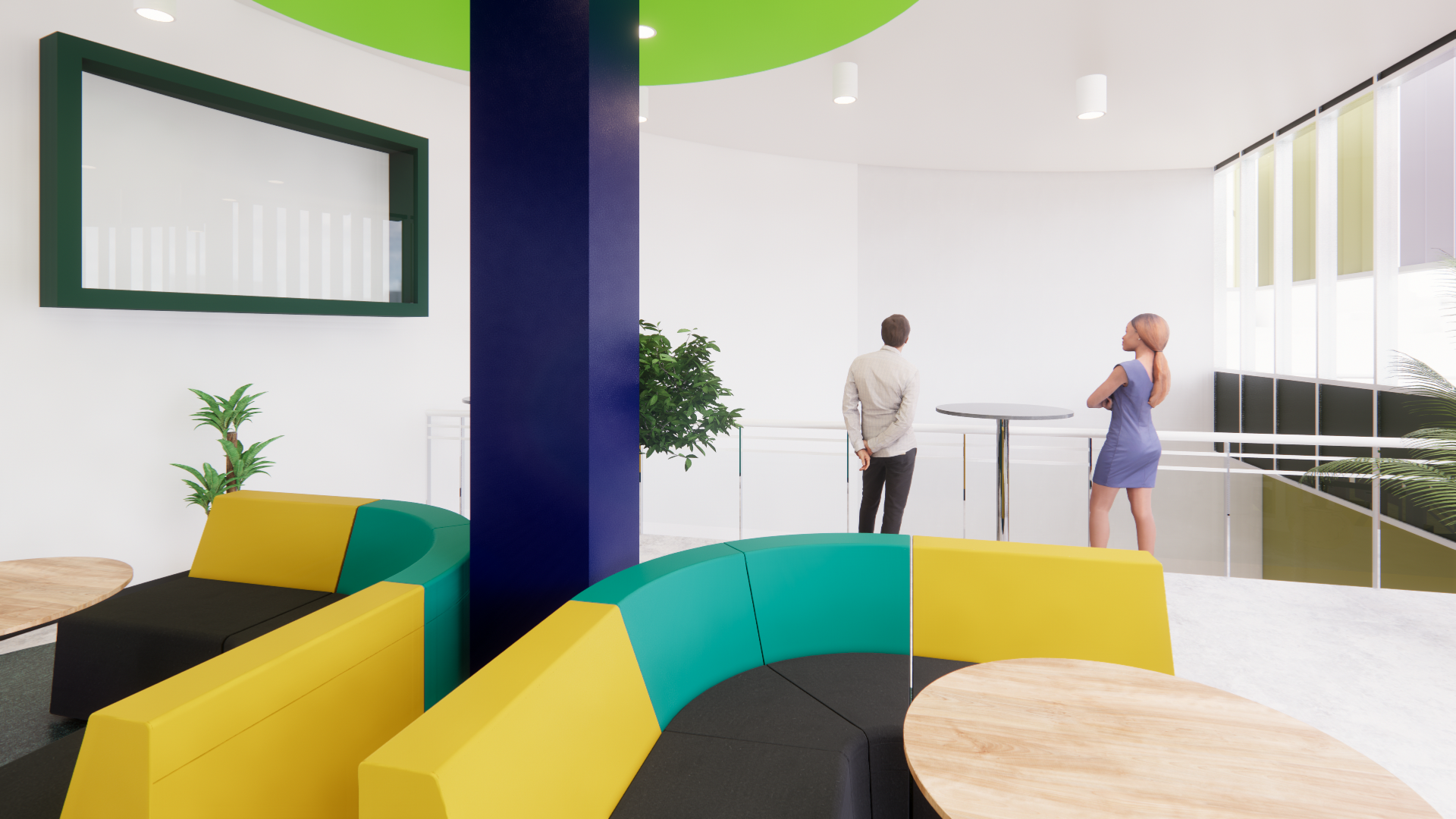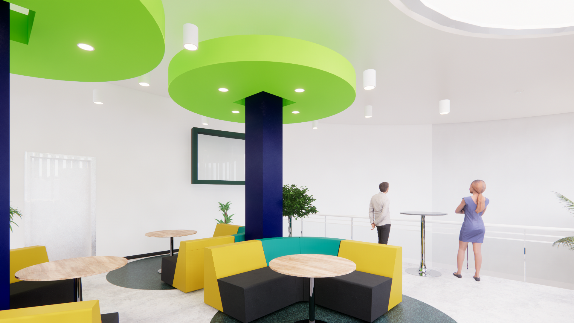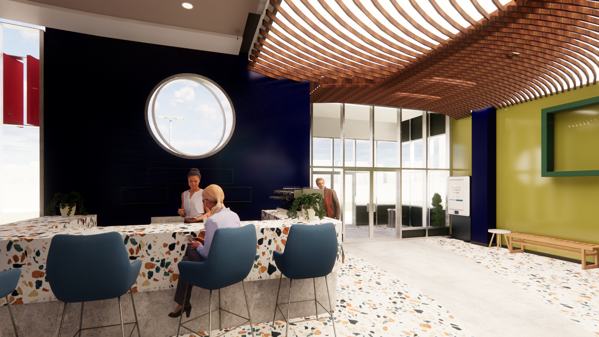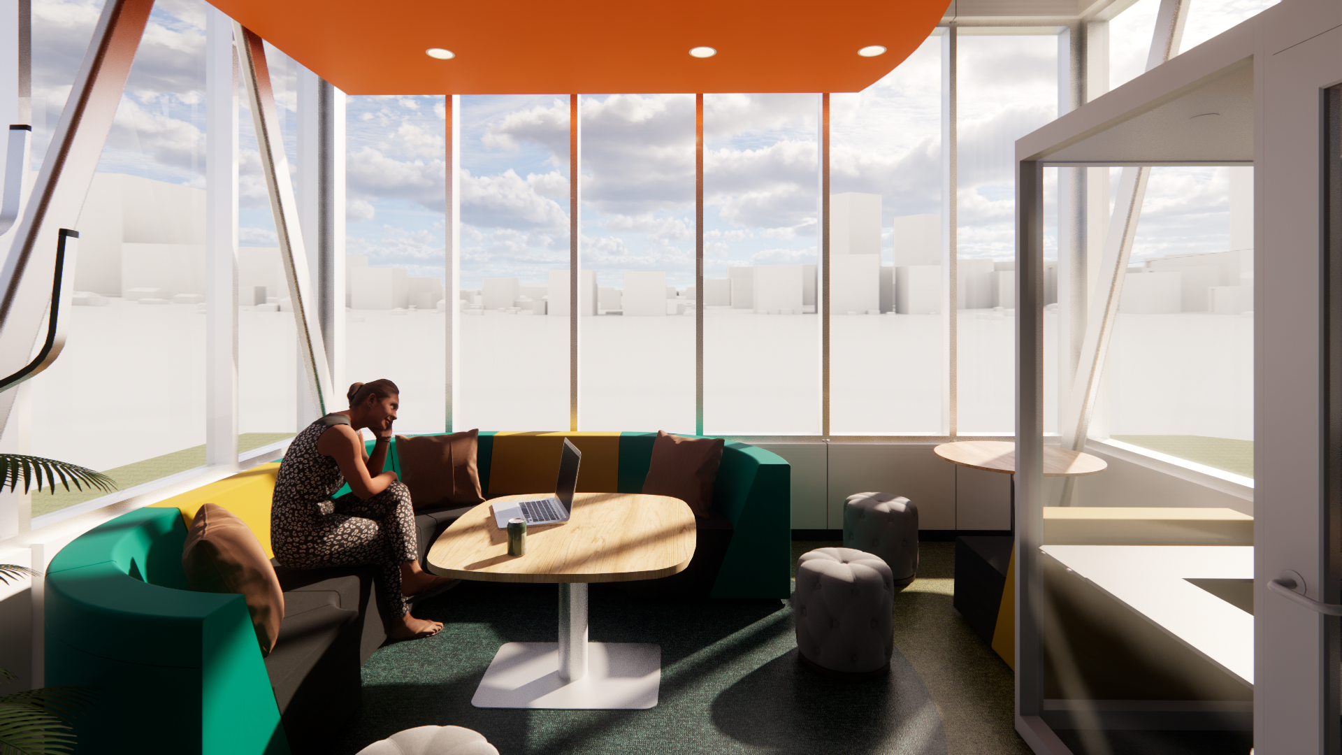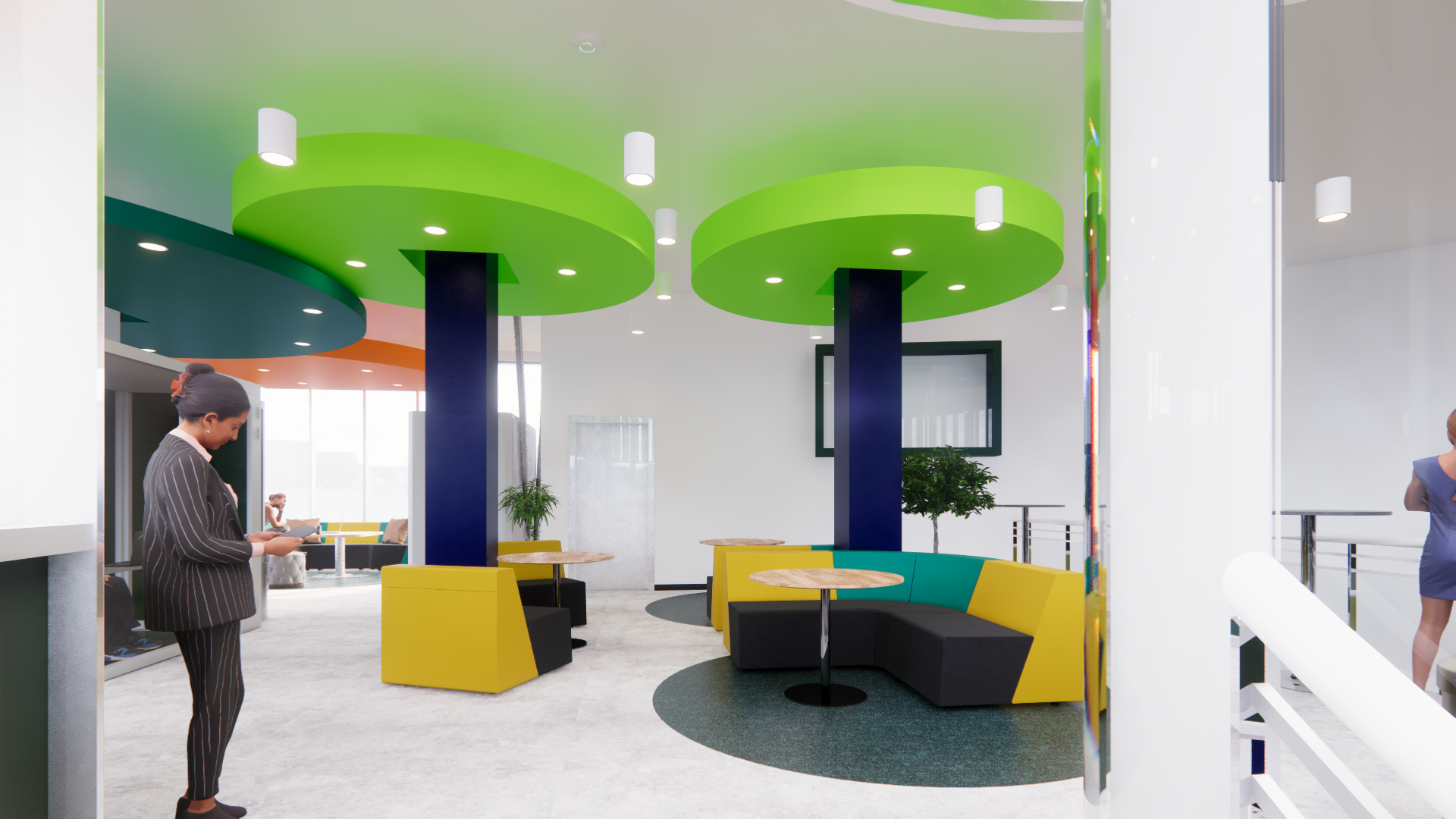 A large, central staircase and round glass elevator were chosen as the central focus point of the building to draw one's eye and the importance of being connected.The open collaboration space can double as a stage for events or as seating for events and studying.Student's work is displayed along the walls and underneath the stairs in easily accessible areas.A kids play area that takes notes from IKEA's Småland is incorporated to accommodate working parents who need a space to work, whether in a group or alone, while having someone watch their kids.A pay-what-you-want style coffee bar is included to acknowledge that you shouldn't be cut off from things just because of your income status.Keeping with the theme of removing income barriers, there are device lockers in the south east entrance that allow visitors to borrow a smart device while on site.