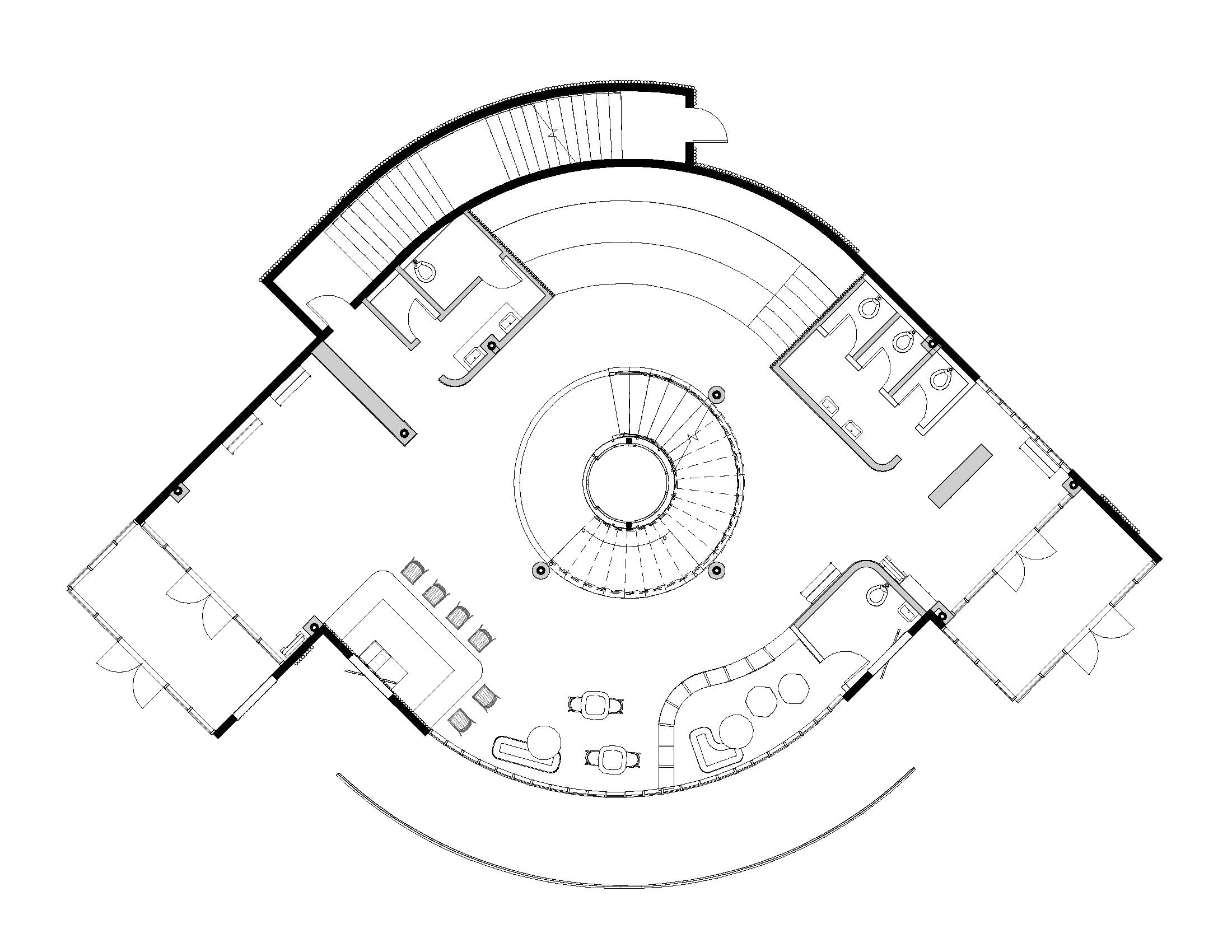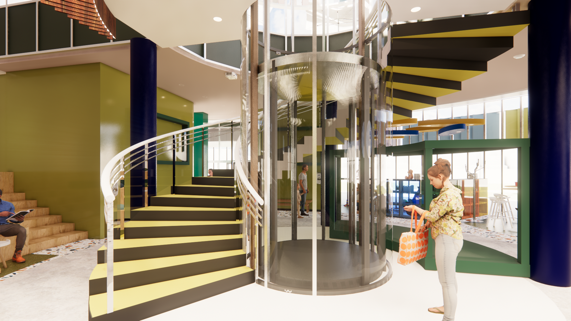 The layout draws users towards the central staircase and glass elevator that connects the space together.