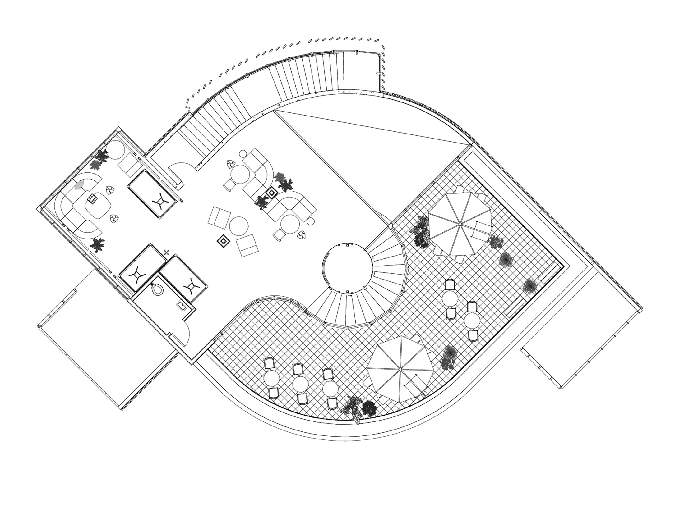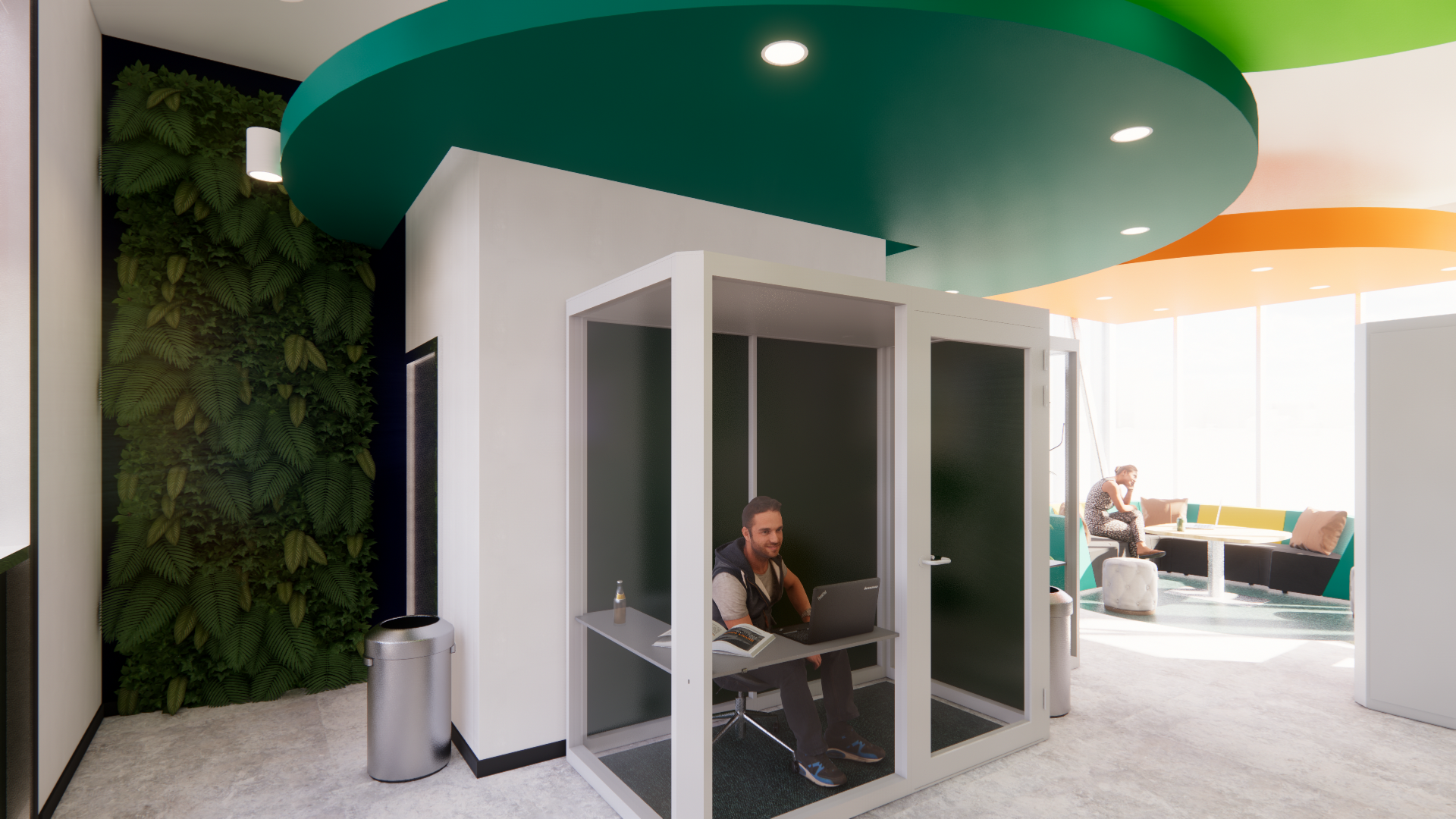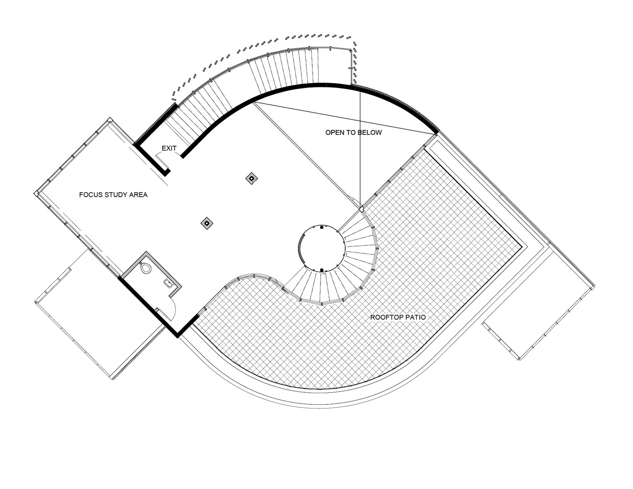The second floor is where the private study spaces are located and connects to the 3 season rooftop patio.